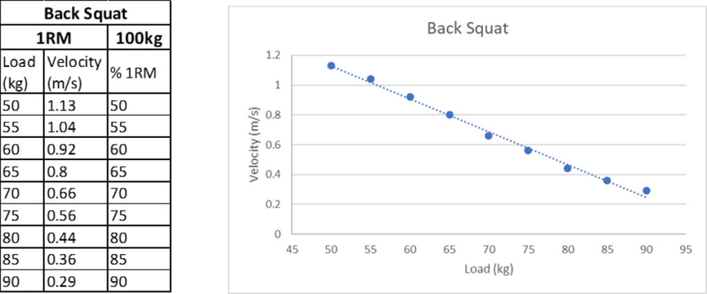 In order to create a load-velocity profile you must first collect the athletes different load velocities of an exercise. For example: you would collect load velocities ranging from 50 – 90/95% 1RM (depending on the level of the athlete). With this data, you can create a load-velocity profile with the use of a spreadsheet (see example below).